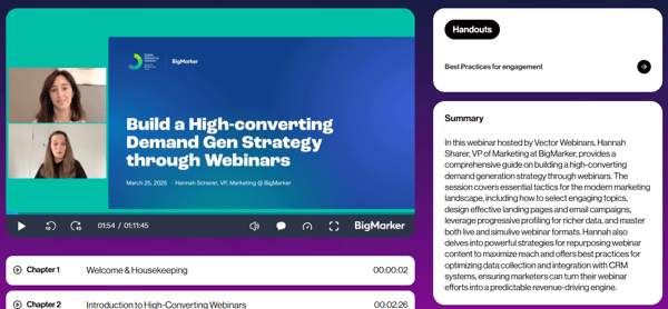 Embed the BigMarker video player on your site and use JavaScript to play, pause, and control the content shown
