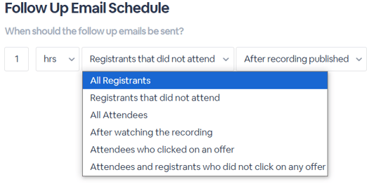 - Post-webinar Emails: These emails are scheduled to send at a relative time after either the session ends or when the on-demand webinar is published. This email is unique in that you can decide which group of your registrants should receive it: