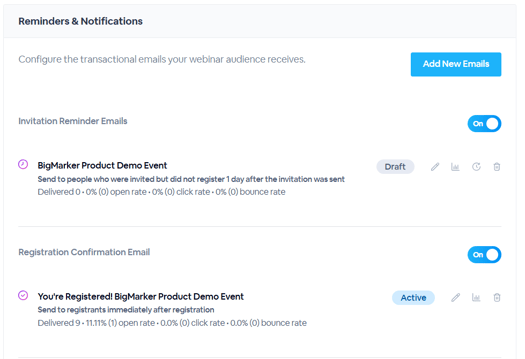 View a comprehensive list of analytics for your webinar or series emails, containing delivery rates, bounce rates, click rates and more. These reports get updated in real-time and show the individual email addresses that are sent to the recipient, if it was sent or blocked and more.