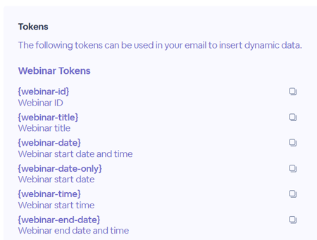 Webinar Details: Here is where your webinar's details will show at the bottom of your email's content. Minimal is needed to change here, as it populates your webinar's link, date, duration, webinar ID and About section automatically. You can customize the email tokens here or change the Webinar details text.