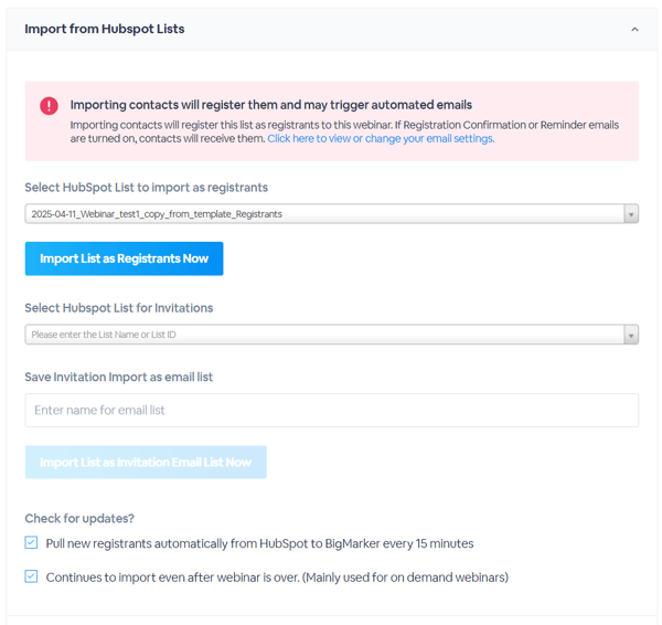 You'll need to select which list to import either registrants or invitees from. You can also choose whether to sync this import every 15 minutes, so new additions to the list will be added to BigMarker. If you are importing registrants to an email list for invitations, you'll still need to configure an invitation email that uses that list.