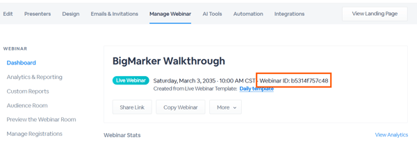 You can get the webinar ID for any session by visiting the main dashboard for the session and looking in the details under the title. If you are using API to get webinar information, refer to here in our API documentation for ways to get the ID for specific sessions.