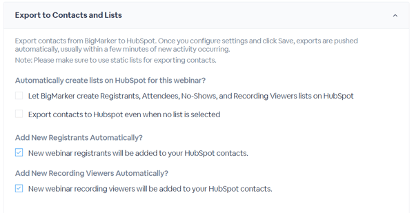 If you are collecting registrants on BigMarker and want to export them to Hubspot, find the settings for Export to Contacts and Lists.