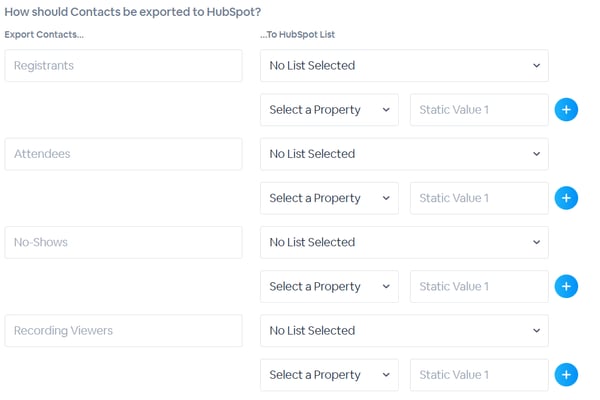 Below these settings, you'll have the ability to choose what list each group or registrants exports to: registrants, attendees, no-shows and recording viewers. If you have enabled Let BigMarker create Registrants, Attendees, No-Shows, and Recording Viewers lists on Hubspot in the settings above, BigMarker will automatically add list for the categories here. For example, the list created for registrants would be “WebinarName_Registrants.”