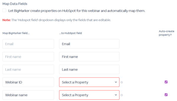 To do this process automatically, check off Auto-create Property on HubSpot and map it to BigMarker box in each field row. What this will do is automatically map all the data fields from BigMarker into your HubSpot integration and adding new properties to do so.