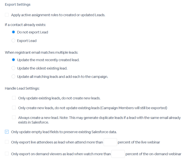 If you only want to export some of your registrants to Salesforce, look for the Export Conditions setting right under the field mapping. Configure this to only export a registrant if they have a specific value in one of their registration fields. This setting is available for both contacts an leads.
