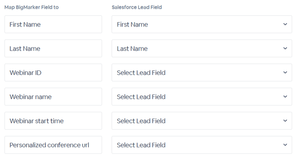 Similar to the other settings for export, you'll map which BigMarker fields correspond to which field in Salesforce.