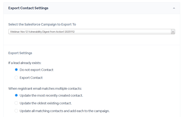 In the dropdown below, select your desired campaign. From this campaign you also have options to Import new leads, import new contacts, and decide if you want to continue to import new registrants after the webinar has ended and become an on-demand session.