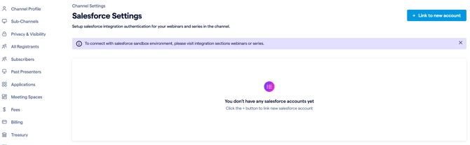 Here you can connect multiple different Salesforce account to your channel. Then, when you follow the steps below, you'll have the option to connect to one of these accounts. Otherwise, you will just have to manually connect to any individual webinar, session or event each time.