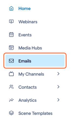 In the Home Dashboard there is a page dedicated to your Emails. here you will find a list of all active emails that you have access to as an admin. These will be across all of your channels, and all of your webinars, series and events.