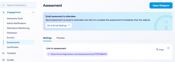 - Send a custom email to attendees post-webinar or event with a link to the Assessment