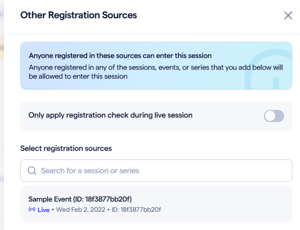 Registration check has been renamed to Other registration sources and you can find it within Basic Setup > Access. Click on the setting to open up the menu that allows you to choose the series and sessions on your channels to add.