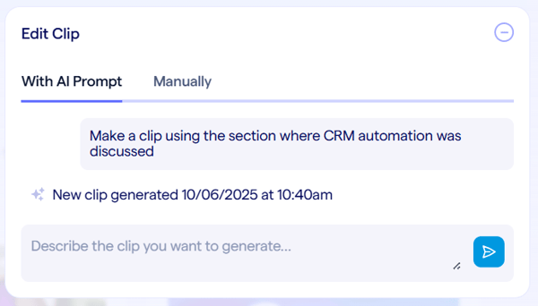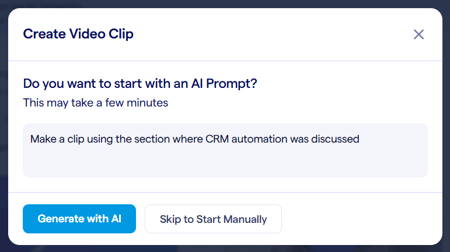 By default, the Content Studio will generate a one minute teaser video and a five minute summary video. To create a new clip, simply click New Video Clip to get started. once you do, a new popup will appear for configure the clip. You'll have the option to give a prompt the Content Studio AI to create your clip automatically, or you can make one manually using timestamps.