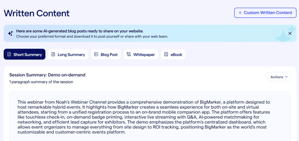 Summarize, add chapters, create video clips and more with the BigMarker AI Content Studio