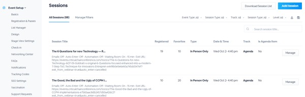 In the sessions section you'll be able to easily create everything from webinars to in-person sessions for your event. Add presenters, pre-loaded content, set which agenda they appear on, and configure emails sent from the sessions, all within the event admin dashboard.
