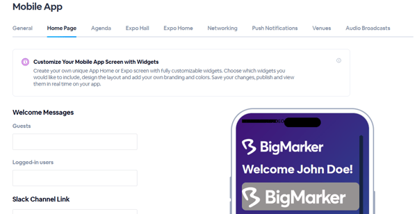 Raise your event to the next level by utilizing the scanner and companion apps. Once first configured by the BigMarker team, you can easily manage everything the app has to offer from these pages in the dashboard.