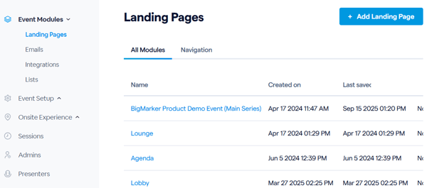Event modules function as the landing pages of your virtual event. Whether it's an agenda, the expo hall, presenter information or anything else, those pages start here.